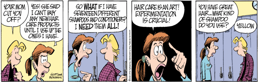 Note 7:   This comment springs from one of my favorite Zits cartoons, in which the teen-aged protagonist Jeremy's girlfriend Sara complains that she needs 17 different kinds of shampoos to care for her hair. She then says to Jeremy, "You have great hair ... what kind of shampoo do you use?" He replies, "Yellow." You can see the cartoon here (return with your "Back" button).