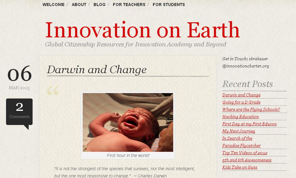 Innovation on Earth - created for the benefit of her students at Innovation Academy Charter School, this is Sara's most current and frequently updated blog. On the right, if you Search, or browse the Archives, you'll find all sorts of interesting entries. For example: