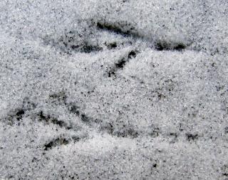 Bird tracksTo the left, the tracks of a different bird, considerably smaller than the turkey tracks. Notice that the feet have different proportions than the turkey feet, although the family resemblance is obvious. Note 1