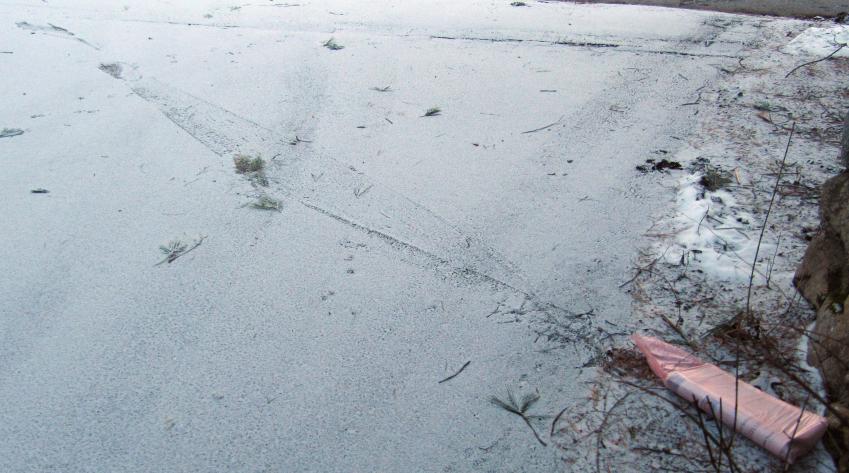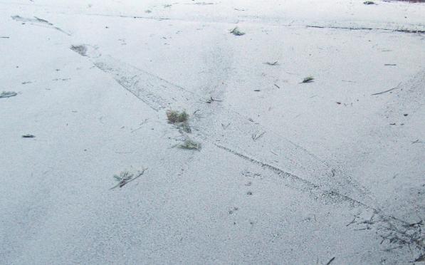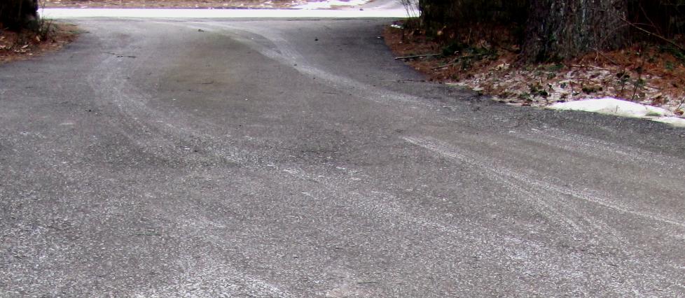 These are the tracks on the dry driveway of Toyotus camry - my Toyota Camry sedan. They're made in the salt and sand put down by the town to melt the snow, dragged into my driveway from the road.