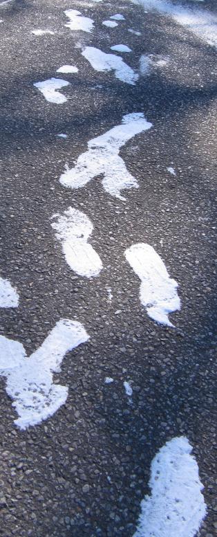 Those are my footprints, plodding out to the end of my driveway in my slippers, to pick up the morning newspaper. This picture was taken after I'd blown away the snow. My footprints remained, where my weight had compressed the powdery snow into the pavement.