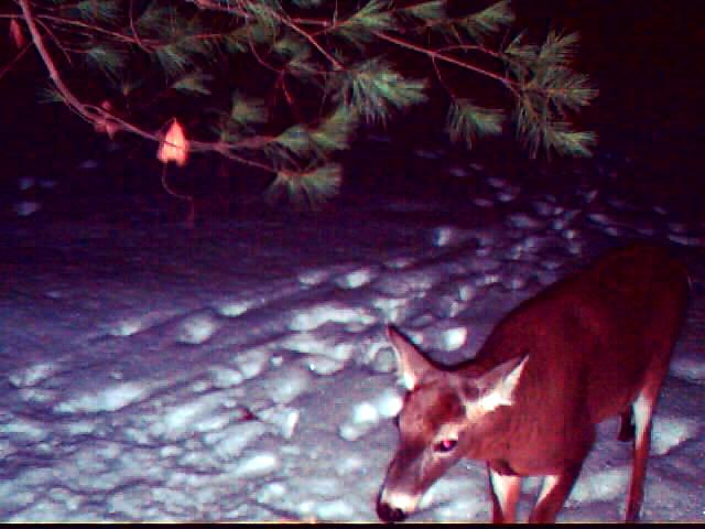 Years ago, my daughter Elissa gave me a "Wildview" camera as a gift. You set it up somewhere (it comes with a strap you can use to tie it to a tree). A motion detector senses an animal going by, and takes a picture of it, firing a flash if need be. The pictures are only 640 X 480 pixels (about 0.3 megapixels), not very high resolution by modern standards, but enough to see what animal visited you. Here's one of the pictures it snapped: