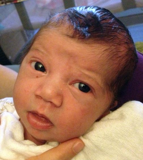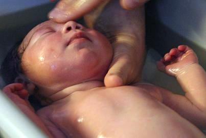 First bathI was present for Dar's first bath, and her reaction was remarkable. She must have had a great sensation of cold as she was unwrapped from her blanket, and motion as she was transported to the tub of warm water. She kicked and yelled. But once she was mostly submerged, perhaps she felt as if she were back in the warm liquid environment of the womb. She became absolutely silent and still, and a completely relaxed, blissful look came onto her face, as you can see to the right (a picture shown in my earlier entry).