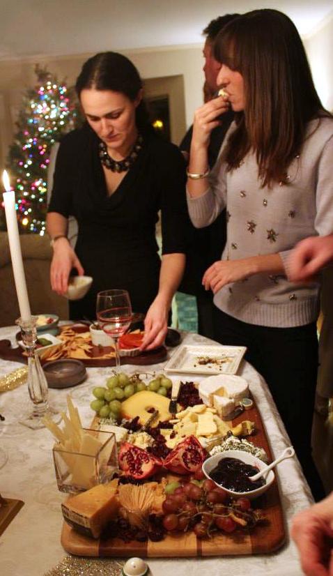 We missed seeing Steve's mother Blossom, and Gary's wife Heide, both of whom were unable to make the dinner. A staggering amount of food was served. Alice (below left) brought her version of my mother's anchovy and pimiento dish, which is always consumed quickly. Below right, Kiera and Rachel sample an enormous cheese plate. And these were only a small portion of the hors d'oeuvres.