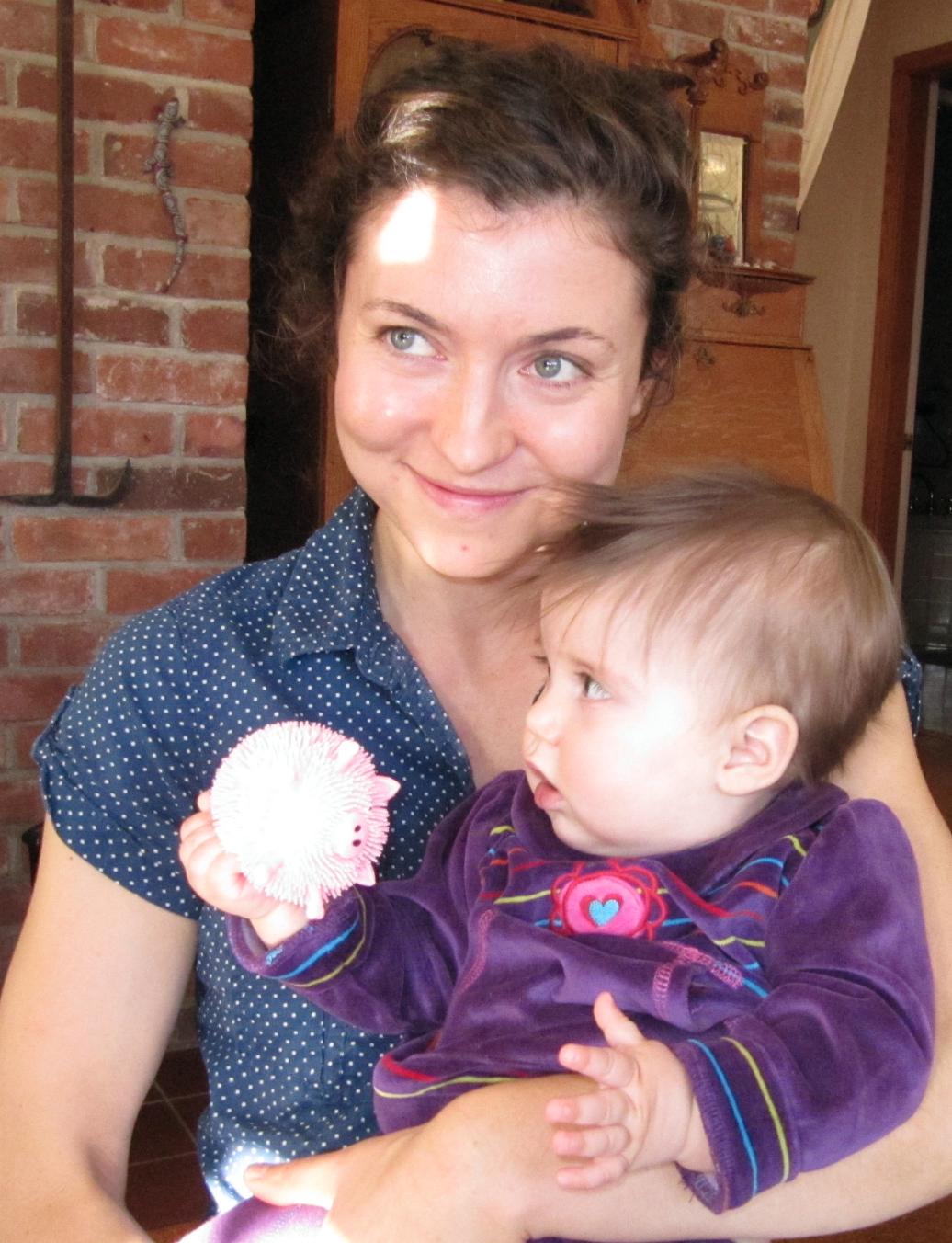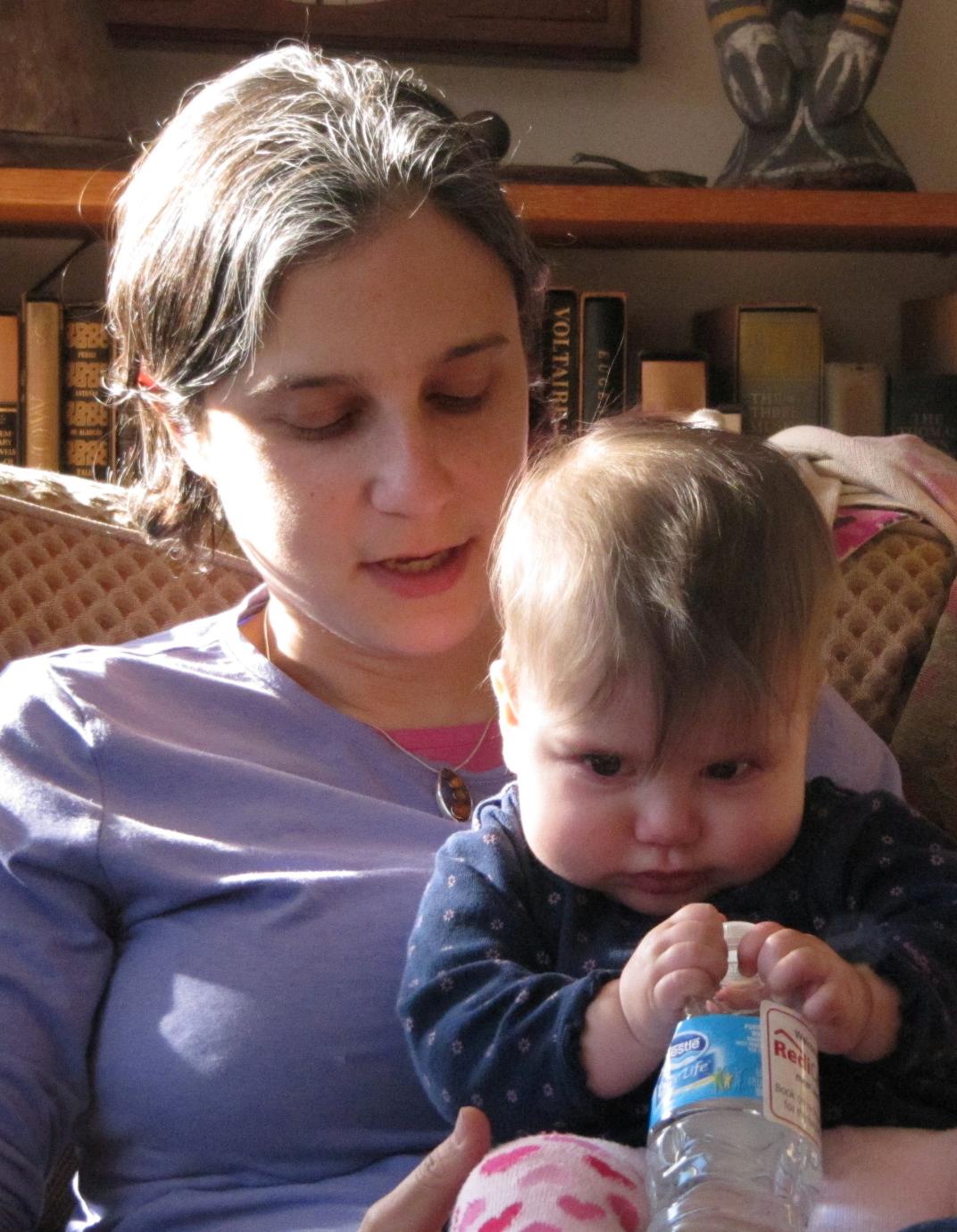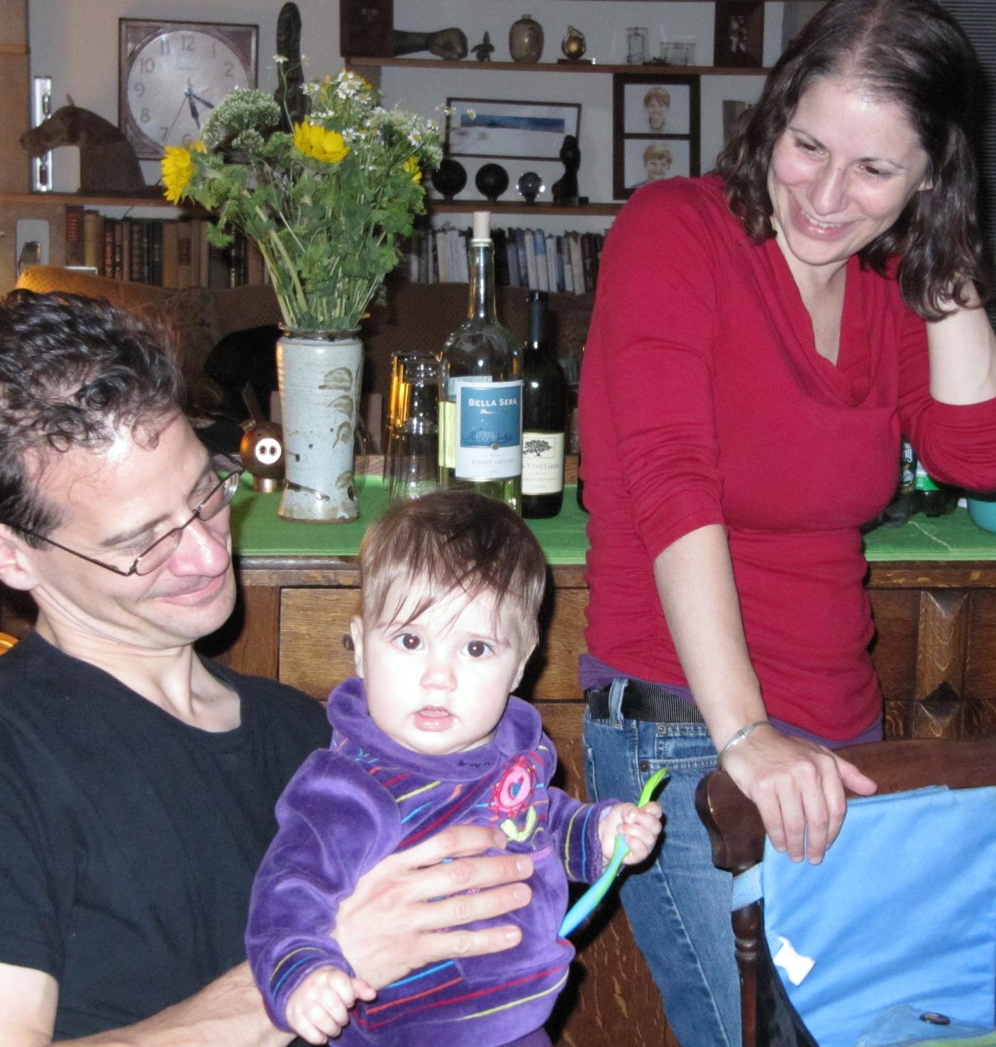 ![]() As noted last week (in Nine months), baby Darwin gets to experience everything for the first time, and a week ago today was her first Thanksgiving. Margie and I drove to western Massachusetts to the home of my sister Phyllis and brother-in-law Peter. We were joined by my sister Alice, our daughters Elissa and Sara, with Elissa's husband Ryan and their daughter Darwin, and Phyllis and Peter's children Jonas and Liza, with Jonas's wife Carolyn and their son Jackson. Also present were Liza's boyfriend Matt, Peter's stepmother June, and June's daughter (Peter's half sister) Melissa. Clutching her spoon, Dar is seated by her parents for a major feature of this event - eating: ![]() Of course, at nine months, she really couldn't eat all the Thanksgiving delicacies the rest of us enjoyed. What passes as Solid food for Dar is more like mush. Still, she's now gotten old enough to seem to enjoy the sociability of the table. Perhaps because she's now in Day Care at least two days a week, Dar is used to interacting with many people, and shows little sign of "stranger anxiety". Thus she was happy to be held by various family members. Click on any photo in this entry to enlarge it, and return with your "Back" button: