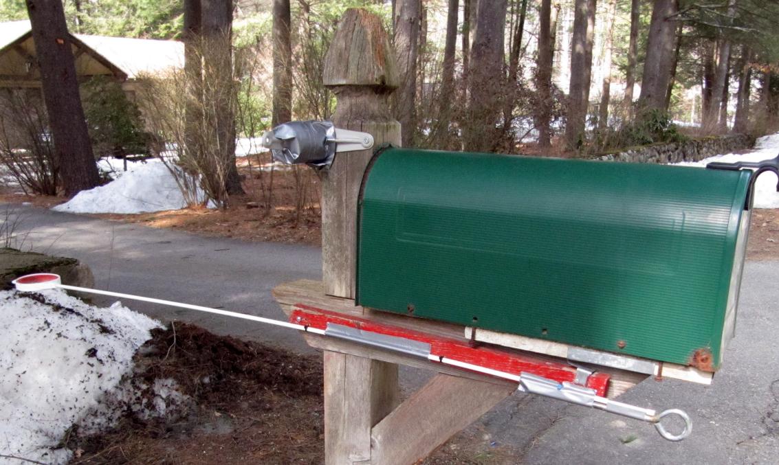 I used a commercial sensor that closes a circuit if a minute current is carried (by any conductive liquid) between the two prongs at the bottom, but I think this could be easily replaced at lower cost with a couple of inexpensive transistors. It seems clear that it would be best to have multiple water detectors in various places in the house - in the laundry room, in the crawl space under our master bath, and so on. Maybe I'll get to that some day. I'd like to have a variety of sensors around the house, actually, in addition to water sensors - things like intrusion detectors, freeze detectors, fire detectors, and so on. There are commercial systems available now that enable you to do this without extensive wiring - the various components communicate by radio. The systems connect to your internet router, and will send you text and/or e-mail messages in case of any problem. The final gadget I'll mention in this entry allows me to see, from my house, whether my mail has been delivered. I built it after I got tired of repeatedly walking out to my mailbox to check for mail, particularly since the hour of our mail delivery is highly irregular. The gadget is a sort of "flag" (made out of a driveway reflector) that pops up, and remains up, when the mailbox is opened. You can see it in its down position in the photo below (on the top-left). Beneath that picture, there's another showing the trigger mechanism in greater detail. The flag is shown in its raised position on the right (indicating the box was opened):