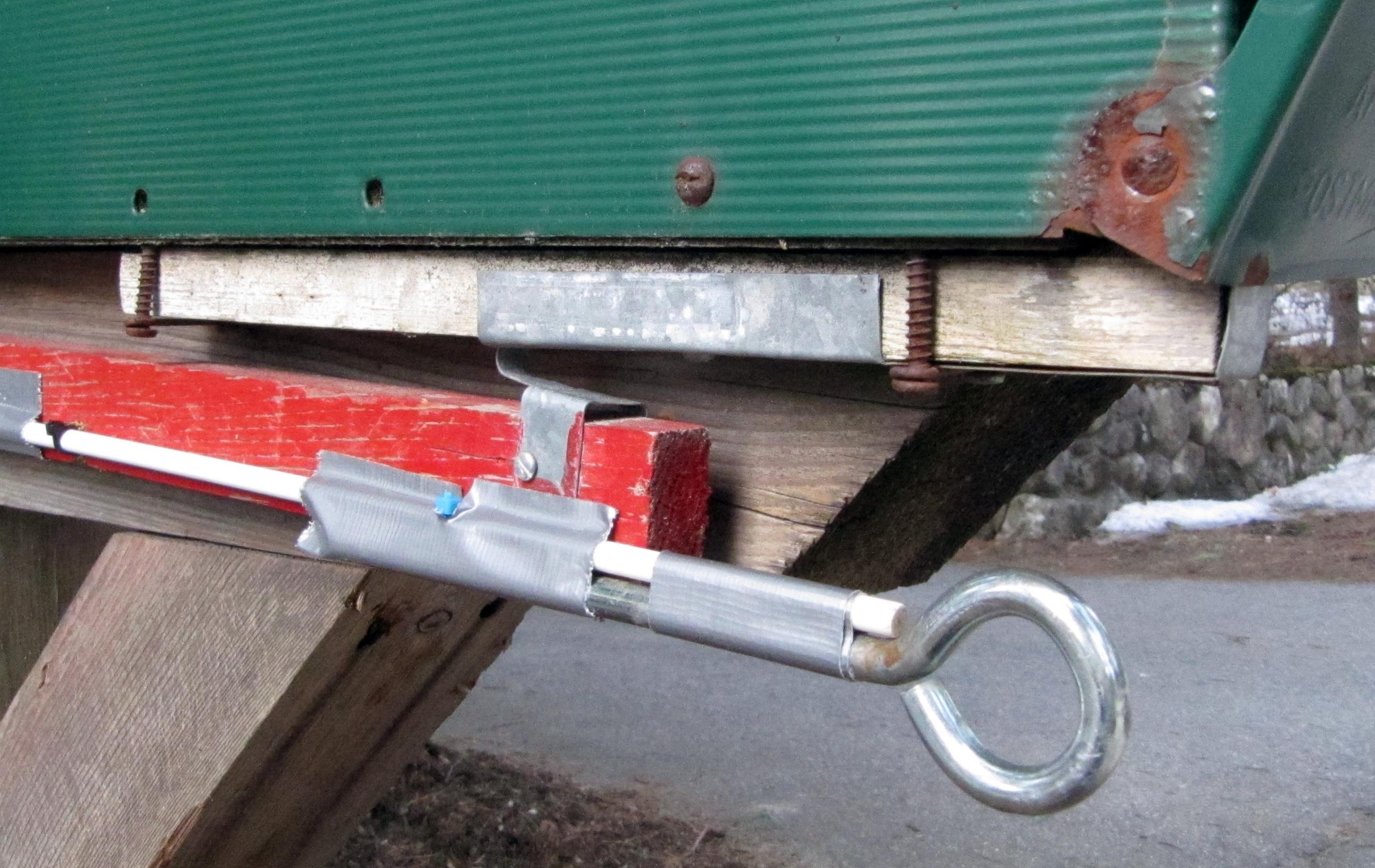 The lower-left picture showing the detail of the mechanism reveals how it works. In the picture, the door of the mailbox (just its bottom is seen in the upper-right corner of the photo) is just starting to open. You can see the bottom of the door starting to lower. As it continues in a circular arc, moving clockwise, it will push the light-colored piece of wood to the left. This pulls a metal tab out of a receiver (a metal ∩ shape) which supports the front end of the red-painted piece of wood (it's hinged at the back end). When the red-painted piece swings down, the flag swings up. The large galvanized steel eyebolt acts as a weight. A foam-rubber-and-duct-tape covered angle bracket stops the rod holding the reflector from swinging too far forward and possibly hitting the mailman. I specifically designed the mechanism so that the flag can be reset with one hand, since the other hand is needed to hold the mail that was in the box. It's possible to swing the red piece of wood up, and then, while supporting it with the left hand, use the same hand to slide the light-colored piece of wood to the right.