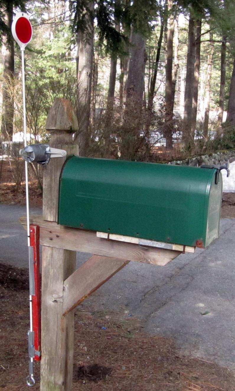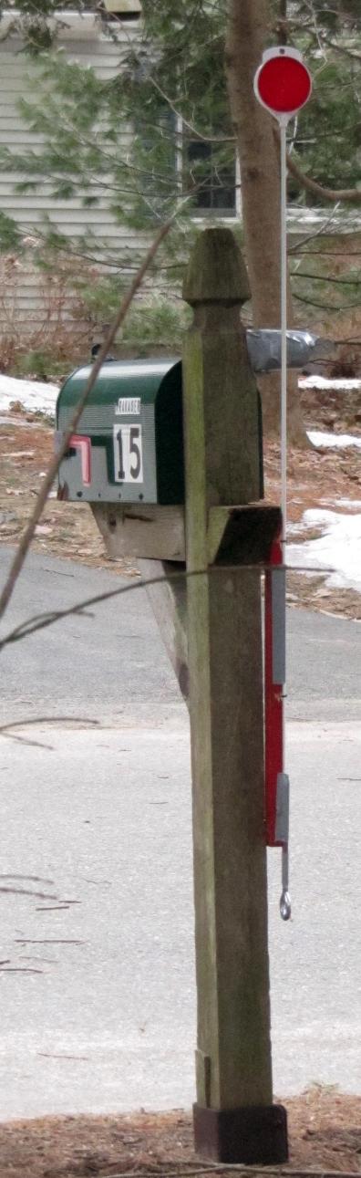 For quite a few years, the flag consisted only of the piece of red-painted wood. That's all that's needed in the Spring, Summer, and Fall. In those seasons, I can see from the house that the red stick has dropped down. But in the winter, in clearing snow from the driveway and from around the mailbox, snow gets piled high between the mailbox and the house, to the point that the low-hanging red stick can no longer be seen. I found myself chopping down piles of snow to be able to see it, and due to the position of the piles that had to be reduced in height, this was a rather awkward process. So I recently grafted the driveway reflector onto the back end of the red-painted stick, adding the galvanized steel eyebolt as a necessary counterweight to it. This raises the highly visible reflective circle well above any snow in the winter, and it's easier to see in the other seasons as well (remember, the mailbox is about 30 meters away, as noted above). I used to love building gadgets, and in fact I still do. I have lots of other helpful things I'd like to build, partly for their utility, and partly just for the fun of it. I thought that in retirement, I'd construct lots of these. But as of October, 2013, I've been retired for ten years, and I find I've gotten around to very few of them. When I first retired, I made rather a point of not having very much that I had to do - I could just relax, without guilt. Even today, ten years later, I can spend a morning doing nothing more than the daily crossword and the Sudoku and KenKen puzzles. In addition, the Internet is a massive time-sink. Once I start browsing news sites, and begin following links sent to me by my Facebook Friends, hours can easily go by. I've recently decided that I don't like this. I'm hoping to waste less time on these pursuits, and have more time for some of my projects. Although some might consider them an equal waste of effort, I think that I'd prefer spending my time that way. But we'll see - habits are hard to break. If I do manage to undertake some additional projects, the loyal readers of my blog will be the first to know.