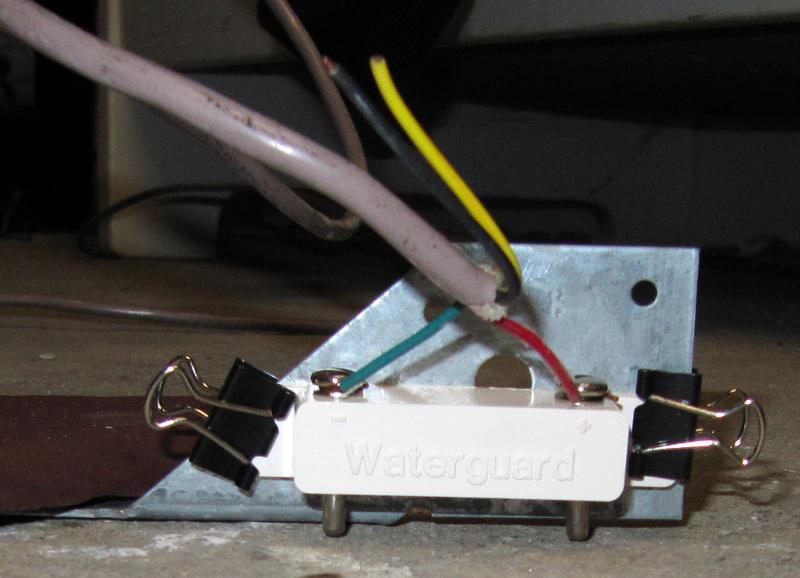 The TEST button turns on the light, verifying that the system is ON, and that the batteries (seen on the left side) are functional. In the attic, on a wooden base, I mounted a snap-type mouse trap, like the one shown below to the left, and a microswitch, like the one shown to the right: ![]() I chose a microswitch with a long lever actuator, like the one shown in the photo, and positioned it so that the rectangular snap arm of the trap, when set (as it's shown in the picture) depressed the lever. I wired the switch in a NORMALLY-CLOSED configuration, so that releasing the lever closed the circuit. Wires from the switch ran down through the wall to the mouse detector circuit board shown above. I mounted it near my bed, so I'd be sure to see it every night. Note 1 Moving from the attic in the top of the house to the basement at the bottom: Years ago, I woke up one morning, turned on a hot-water tap, and nothing came out. I raced down to the basement, and found it to be full of water to a depth of about 8 cm (about 3 inches). Our water heater had burst, and water had been pouring into the basement all night. Needless to say, many items stored in the basement were destroyed, and a major cleanup was required.
