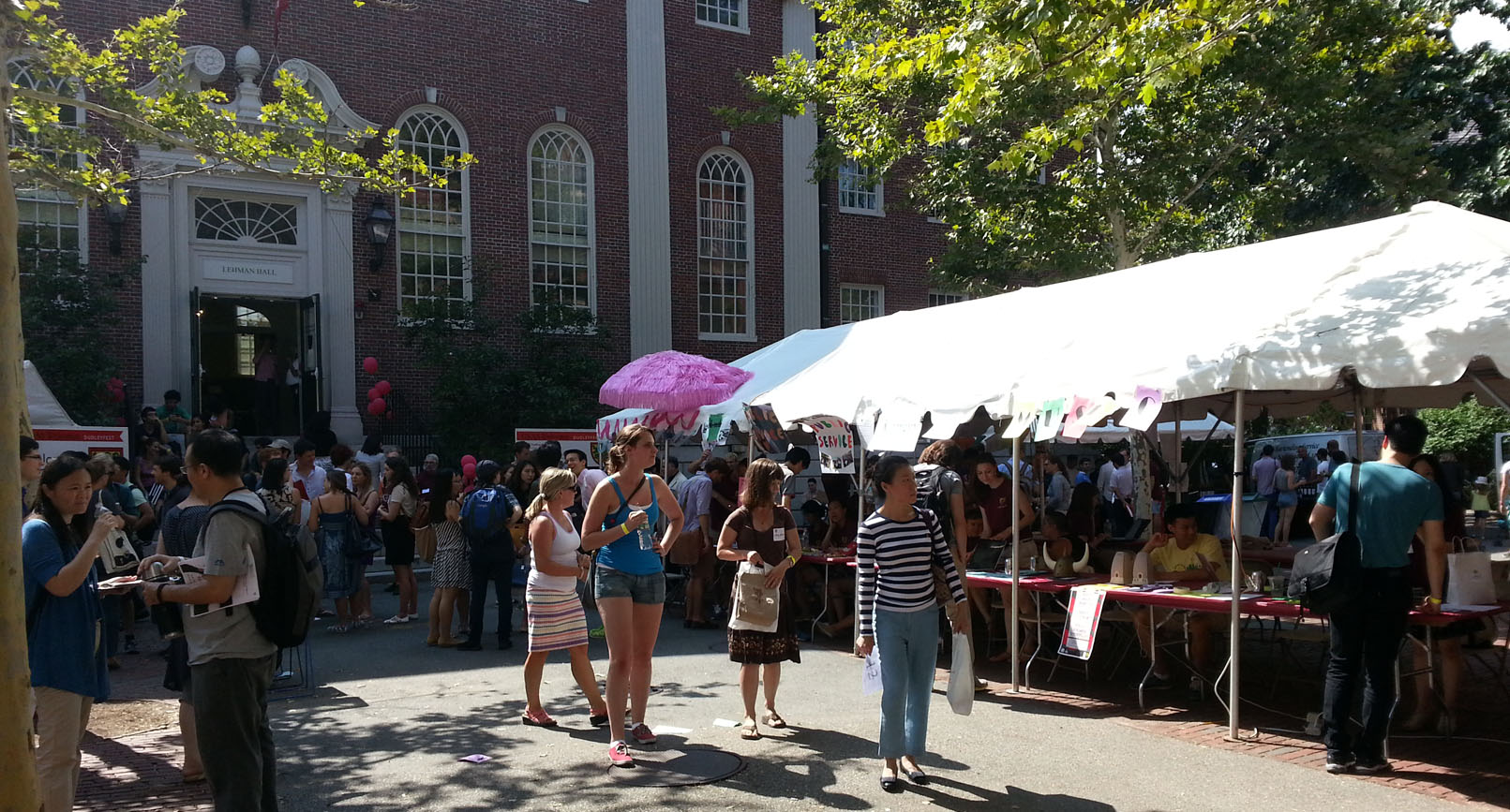 ![]() One day less than a year ago, I posted a blog entry about my granddaughter Darwin's first exposure to Solid food. At the end of the entry, I described how Margie and I had met Elissa in Harvard Square the previous day, Wednesday, August 28, 2013, a day after Dar's six-month birthday. We had then pushed Darwin around Harvard Yard in her stroller until she fell asleep. We took care of Dar that day because Harvard's Fall semester was starting. Dar's mother Elissa teaches at Harvard, and she had a meeting with her freshman advisees. And since Ryan had also gone back to work, and Dar had not yet started daycare, Elissa needed help caring for Dar during the meetings. This event was repeated this August, almost exactly a year later, Wednesday, August 27, 2014, to be precise. Since the date of a particular day of the week a year later is one day earlier, this time the meeting fell exactly on Dar's 18-month birthday. She's changed a lot over the past year. Like the previous year, we met Elissa in front of Au Bon Pain in Harvard Square, and had lunch in their open-air seating area (Dar had frozen peas, and a full container of yogurt). We then pushed Dar in her stroller across Massachusetts Avenue, and into Harvard Yard. I didn't say much in last year's entry about the goings-on in the Yard that day, other than noting Dar's being "pushed in irregular loops among all the incoming Harvard freshmen." In fact, there's always a lot happening on this day in Harvard's calendar. Yesterday we saw students moving into the dorms that surround the Yard, and people walking around carrying boxes and dragging suitcases. There were tour groups and tourists all over the place, I imagine including a lot of the families of the incoming freshmen. And quite a few sizeable tents were set up, to introduce incoming freshmen to the various Harvard activities open to them. Here's just one of the tents that was set up in front of Lehman Hall: ![]() Someone was dressed up in a lion costume approximately in the area shown in the photo. I didn't envy him, since the temperature that day was around 32 degrees C (around 90 degrees F). Dar can recognize a lion, and generally answers the question, "What does a lion say?" with "Roar!". So I pushed her up to see the lion. This proved unsuccessful, as when the lion approached, Dar broke into tears. I quickly retreated.