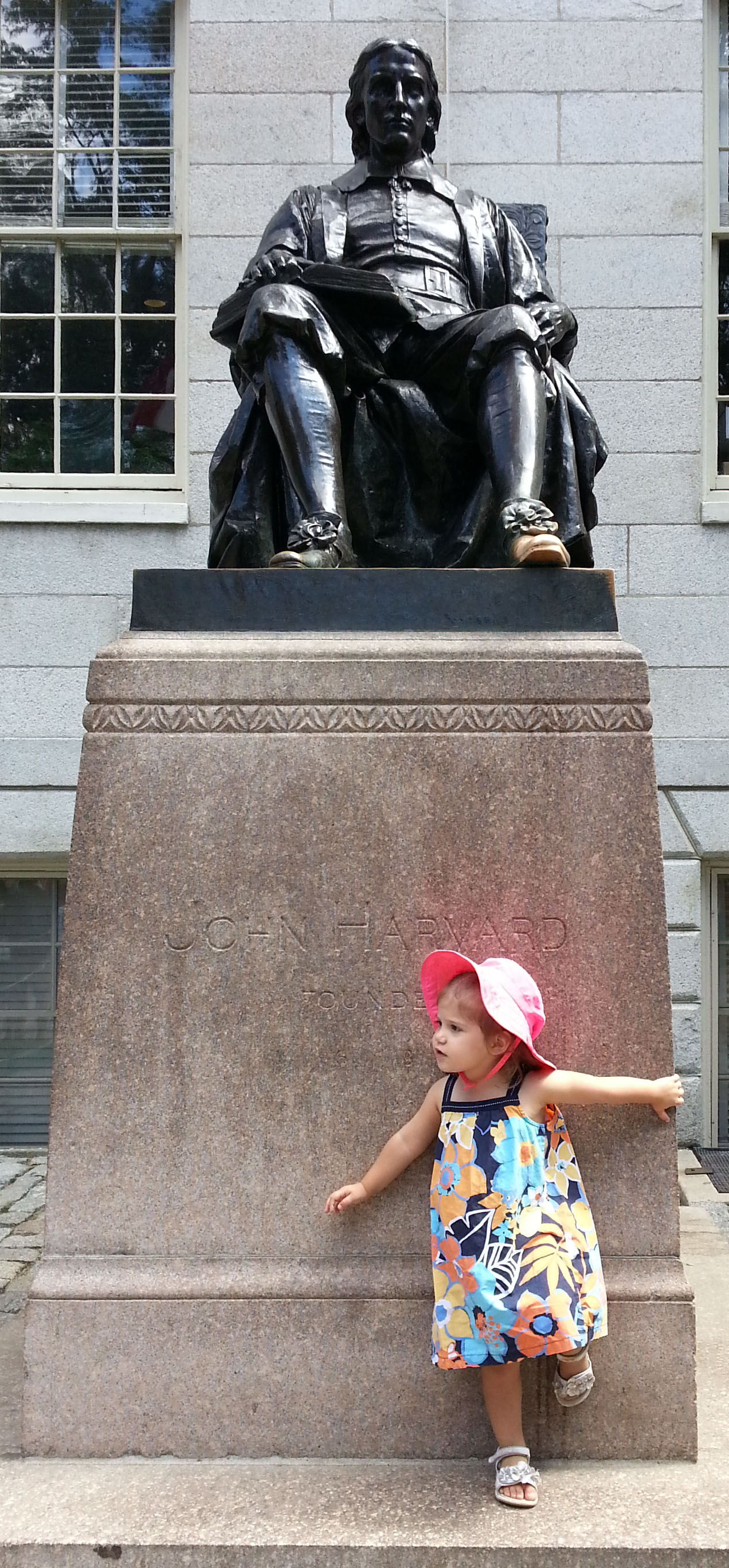 Each year kicks off with a lunch for incoming freshmen, and for three years in a row now, Margie and I have watched Darwin during this event. All sorts of activities for the incoming class are always in progress in Harvard Yard, where we've generally spent most of our time. Since Darwin was born in late February, and this event occurs in late August, Darwin's age the first time was six months, then 1.5 years, and this year 2.5 years. In fact, this year (2015), the event occurred on exactly the day that Darwin turned two and a half. The photo to the left shows Dar standing in the Yard under the statue of John Harvard. We waited our turn among the tourists taking similar photos. John Harvard's left foot is shiny, as tourists seem to rub it for luck. The first two times we did this, Darwin was still taking naps around lunchtime. So on both occasions, we mostly wheeled her around the Yard in her stroller until she fell asleep. The end of my 2013 blog entry called Solid food mentioned our caring for Darwin that year, and introduced my observation that Elissa had "Parked her Dar in Harvard Yard". We got a lot of exercise, since we pushed her around for an entire half hour. At six months, continuous motion of the stroller was needed to keep her from waking up. In 2014, I wrote an entire blog entry about the event, called Harvard Yard. At a year and a half, Dar was still taking a mid-day nap, and that entry has a picture of her sleeping in her stroller. But it also has a video of her collecting rocks and acorns in the Yard, an activity she engaged in enthusiastically after she woke up. And Footnote 2 of that entry explains the phrase "I parked my Dar in Harvard Yard", for those who might not know what it means. This year, at age 2½ (exactly), Darwin stayed awake the entire time. We met Elissa and Darwin as usual at one of the outdoor tables in front of the Au Bon Pain restaurant, where we ate lunch. We then crossed Massachusetts Avenue and walked into Harvard Yard, which as usual was full of incoming Harvard freshmen and their families. Darwin observed the crowd with great interest, and then remarked to Margie (with a tone of surprise, Margie thought) that she didn't know anybody. I later calculated Darwin's college graduation year, assuming she enters first grade in the Arlington school system at six years of age. That puts her in the class of 2035. Curiously, that's exactly 100 years after my father, Daniel David Krakauer, graduated from Cornell University. That surprised me a bit, because Dan was born in 1915, and Dar was born 98 years later, not 100 years later. It seems that Darwin will graduate at age 22 years and a bit over 3 months. But if my calculations are correct, assuming Dan graduated in June, 2035, he was only 19! He didn’t celebrate his 20th birthday until September 16, 2035. Perhaps he was in some sort of accelerated program in High School. After spending some time in the Yard, including photographing Darwin in front of the statue of John Harvard, we walked through Harvard Square to the Curious George Store, where we spent the remainder of our time. There, Darwin mostly played with some Legos, but before we left, Margie bought her a Curious George astronaut doll. If asked, Darwin will say, "Daddy and Papa are suckers." We asked, "What about Nana?" Dar replied, "Nana is a teeny-tiny sucker" (illustrating the point by holding her thumb and index finger about half a centimeter apart). Actually, behind the scenes, it's Margie who buys most of the stuff we give to Darwin, using her standing accounts at Zulily and Amazon Prime. Yesterday, to allow Elissa and Ryan time for other activities, Margie and I took Darwin to lunch at an Arlington restaurant. Elissa gave us a bag containing food for Darwin to eat, since it is often best to get her started on her meal while our own food is being prepared. Dar seemed to have a prodigious appetite at this meal. She started by polishing off a tube of yogurt, followed by a serving of string cheese (after carefully instructing me in the proper way to open each of these items). She then requested a granola bar which we found among the food items in the bag, and instructed me as to how to tear it up into bite size pieces for easy eating. For a lunch item, the granola bar seemed to us to have an awful lot of chocolate in it. It was full of chocolate chips, and had chocolate drizzled on top. It later turned out that Darwin had smuggled this item out of her mother's purse and into the food bag. Papa and Nana are suckers, indeed. However, finishing off the granola bar didn't stop Darwin from subsequently eating half a bowl of rice which we had ordered along with our own meals. I'm guessing we can expect a growth spurt soon. When Elissa later asked Darwin what she had eaten for lunch, she replied "Rice". By the way, after I sent the above picture of Darwin to Elissa, she sent me a link to an interesting article about the statue. The article makes three points about the statue and its inscription, which are: