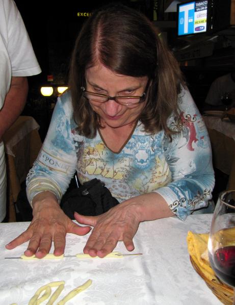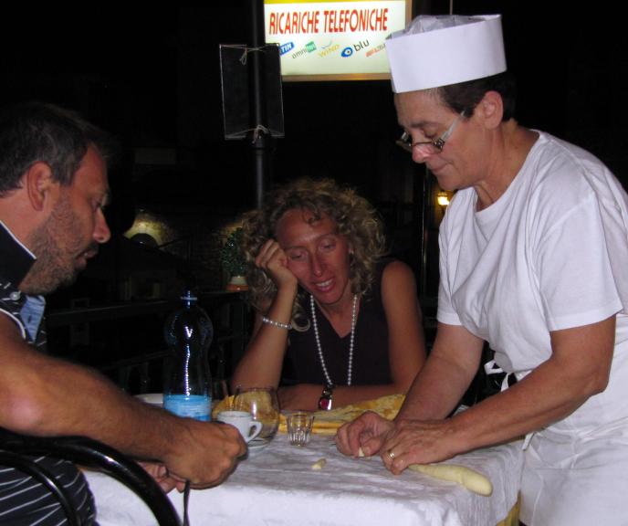 Some were rowing standing, gondolier style, as shown in the photo to the left (click on it to see a larger version, and return with your "Back" button). Others rowed more conventionally. Some were in costumes, and there was a varied assortment of different types of boats. The photographer informed us that they were all preparing for an annual set of races called the "Vogalonga", featuring various types of human-powered craft. She just happened to mention that this meant that on Sunday, the Grand Canal would be closed! We were rather astounded to note that there were no visible announcements of this event, which would clearly affect the entire city. And it would certainly affect us, since we were scheduled to take our heavy luggage to the train station at around noon. Well, apparently not on a vaporetto, nor on a water taxi. Inquiries at our B&B confirmed the photographer's information, although they hadn't thought it worthwhile to inform us of it. An inquiry at the Rialto vaporetto stop confirmed that the vaporetti and the water taxis would stop running on Sunday at 7:30 am. Note 1 This episode struck me as typical of Italy, where there's a certain "What the hell, people will manage" attitude. In discussing it with an Italian man, when I suggested that there were thousands of tourists in Venice, and it might have been nice to find ways to notify them of the disruption this event would cause, he replied something to the effect of, "But that would take a lot of coordination". He rolled his eyes, as if to imply that such coordination was beyond the realm of possibility. Remember, we had only found out about this entirely by chance. A conceivable scenario would have been for us to appear at the Rialto vaparetto stop a safe half hour before our train departure, only to discover for the first time that neither the vaporetti nor the water taxis were running. At that point, it would have been impossible to make our train. Yet the trivial method of posting of signs at the vaporetto stops a few days before would have avoided this possible dilemma. In Milan on the same trip, we wanted to visit the Peck delicatessen, but found it closed, its windows covered by steel rolling shutters. There was no sign to indicate if it was closed all day Monday, or just closed for lunch. A woman at the desk of the adjacent Hotel Spadari patiently informed us, in excellent English, that they would open at 15:00. When we noted the lack of any sign to that effect, she cheerfully said, "That's OK, people can just come in here and ask me". Well, OK, but in fact we had asked several other people before we had gotten to her. As the shutters on the Peck were retracted, a sign giving the hours of operation came into view on the window. It turns out Peck is closed Monday mornings, but of course, when it is closed and the shutters rolled down, you can't see the sign. Didn't this problem occur to anyone? Couldn't they have found a place to put the sign outside the shutters? Margie and I just got back from 2½ weeks driving around the island of Sicily. We love traveling in Italy. The people are warm and friendly, there are interesting things to see, the food is good, and the language is musical. And who but the Italians could have taken a single simple food, pasta (which literally means "paste"), and turned it into nearly 100 "different" foods, largely by forming it into different shapes? At the end of our first full day in Italy, we had dinner at the Ristorante Malvasia in Taormina. At the end of the meal, the chef came out of the kitchen and started demonstrating how to roll maccheroni, rolling out the dough right on the tablecloth at an adjacent table. A wire runs through the center of the dough to make the hole, after which it's pulled out. Note 2 There's a picture of the event below on the left, and then on the right, Margie giving it a try (you can click on each picture to zoom out a bit and enlarge, and then return with your "Back" button): ![]() But Italian travel often does require putting up with a certain amount of disorganization. Step one, of course, was getting there. We booked a flight to Catania on the east side of the island of Sicily, booking on the Delta Airlines website because we had a credit that Delta had given to us as a result of seat assignment problems we had on an earlier Delta flight. After buying our seats online, we spent a little bit of time on the Delta site selecting our seats for each of the four flights involved. Because of our earlier problem with Delta seats, we subsequently telephoned to verify that our seats actually had been assigned. It turned out that the flight was not really a Delta flight, but it was being operated as a "codeshare" by the Italian airline Alitalia, so we called them. In that way we discovered that Alitalia had absolutely no record of any seat assignments whatsoever. We worked with the representative on the phone to have new seats assigned, although they were not as good as the earlier ones we had selected on the Delta website. The morning of our departure, I received a couple of e-mail messages from Delta announcing that we could now check in online for our flights. I clicked on the link they gave which read "Print boarding Pass", and was taken to an Alitalia website. Unfortunately for most American customers receiving these e-mails, the website was entirely in Italian. I could see no link to click on to change the site to English. That's okay, I speak Italian, so I proceeded to follow the instructions to print my boarding pass. But after entering all the required information exactly as requested, it simply didn't work. Then, when we showed up for the flights, it turned out we again had no seat assignments. I pointed out to the Alitalia representative behind the desk that we had been given the seats over the phone by Alitalia itself, months in advance. She mumbled something about Alitalia having more than one computer system, and the systems not talking to each other.