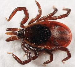 A female deer tickThis blog entry is about the nasty creature shown to the left, the deer tick, Ixodes scapularis (also called the blacklegged tick).