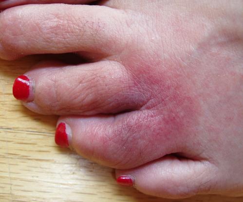 What was this? It didn't seem like the characteristic bull's-eye rash of a Lyme infected tick bite, but then again, bull's-eyes normally form on flat areas of skin. Could this be the form the rash takes on toes? Margie was not aware of having been bitten by a tick, but then it could have easily hidden between the toes (the photo shows the rash in its early stages - it actually spread more widely).