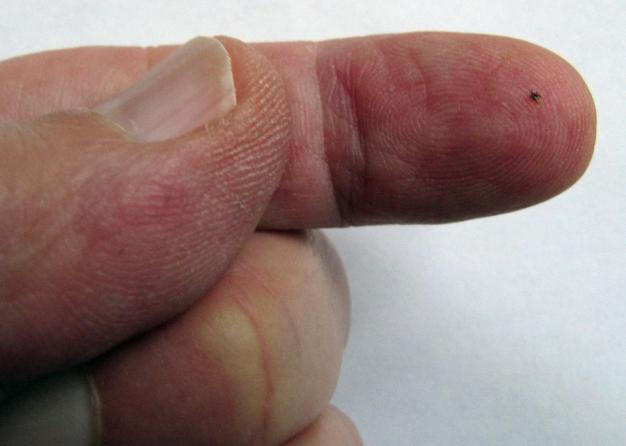 I've been showing you blown up pictures of ticks taken with my camera in macro mode. Some of my readers with dogs may be thinking these are similar to dog ticks, which are often half a centimeter long (0.2 inches), and even larger when engorged. This is not the case; even in its nymph and adult stages, Ixodes scapularis is tiny. The picture below shows the tick two pictures above (the one that's not engorged) on the tip of my finger; it's less than a millimeter long. And I spotted it sucking on my ankle - but remember, I was sharp-eyed enough to have once spotted a larva.