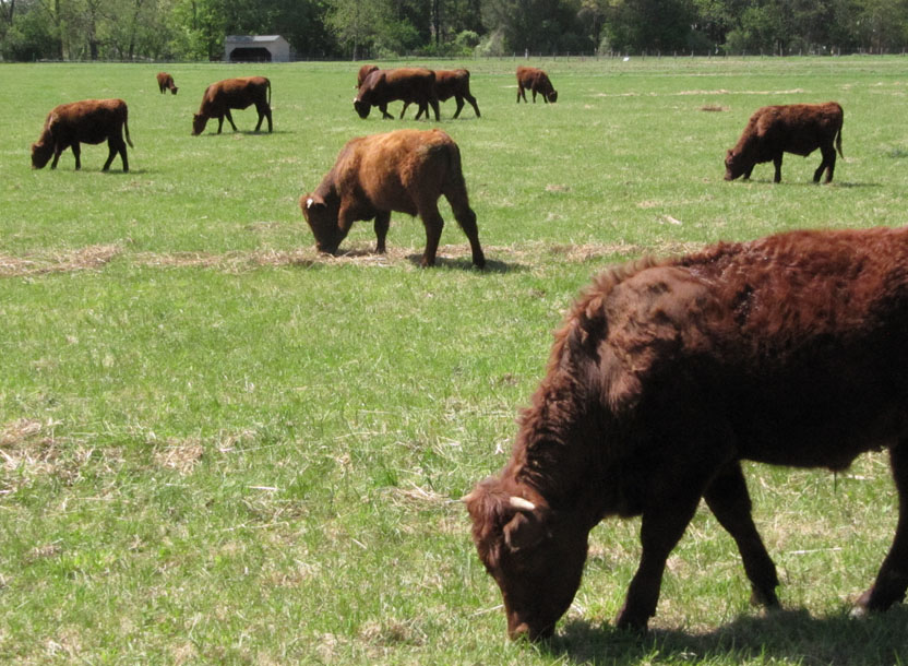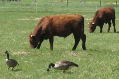 We usually see the cattle standing quietly in groups, munching on the grass. They're often mixed in with flocks of Canada geese, a few of which can be seen in the picture below to the left. In a rare show of energy yesterday, one of the bulls broke into a run across the field, and I captured him on the move with my camera (below right).
