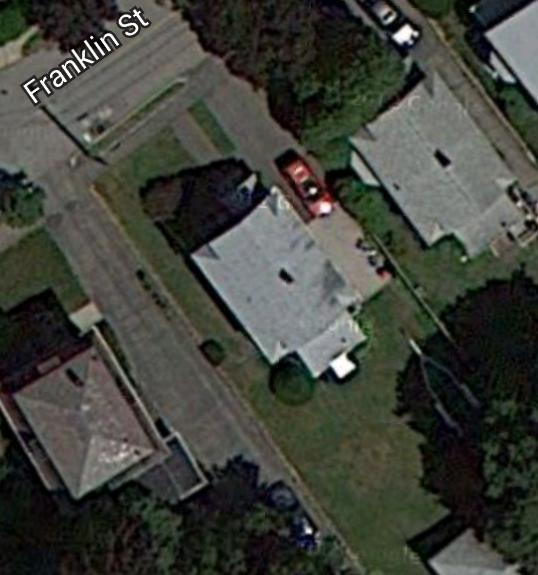 So naturally, I called up Google Maps on my cell phone, and started scrolling the satellite view across the screen, looking for a house that might match the view of the house being shown on TV. Franklin Street is not very long, so it didn't take much time to come up with the image below: