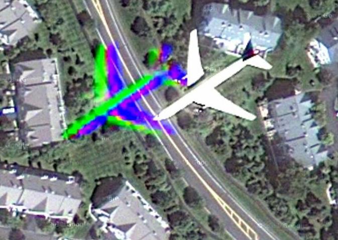 An airplane, which Steve identifies as a 737, just happened to be flying below when the picture was taken. I don't understand the brightly colored image to the plane's left, but I suspect it's a camera artifact due to the very bright solar reflection from the plane's shiny surface. If you want to see this image on the Google site, where you can zoom in and out, go to http://goo.gl/maps/NgECB.