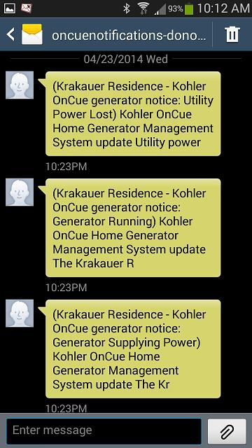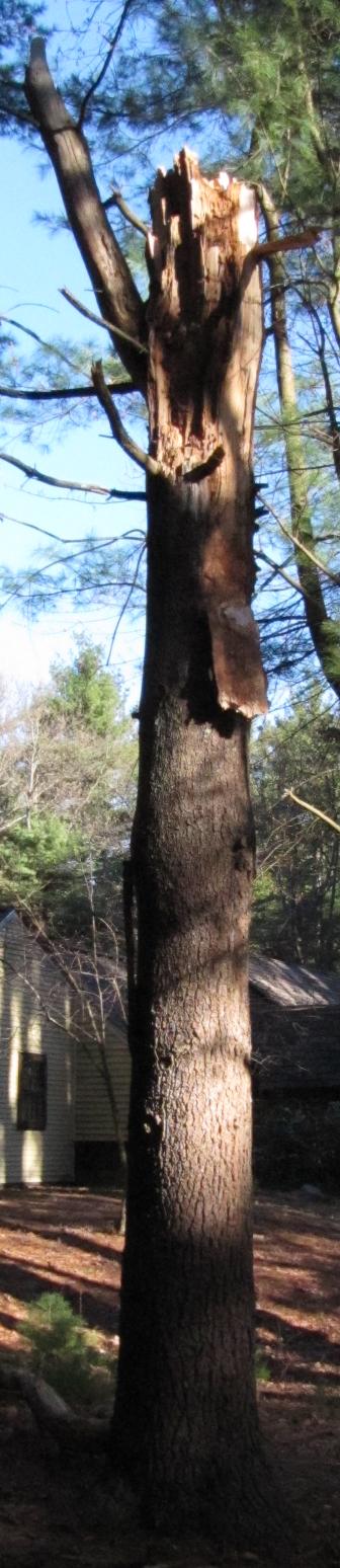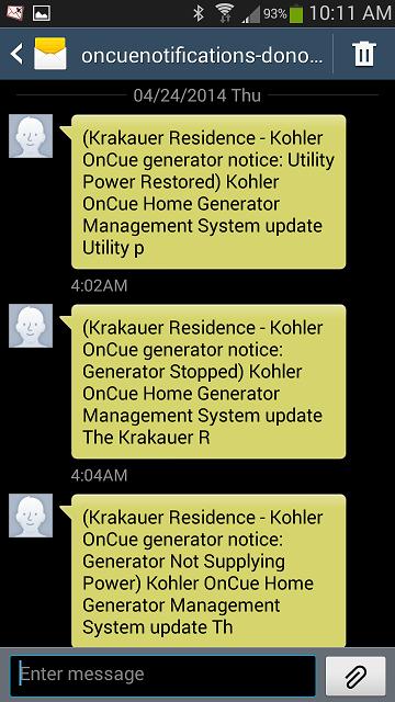 You can see to the right that the generator reported first "Utility Power Lost", followed by "Generator Running", and finally "Generator Supplying Power" (I have no idea why Kohler thinks these need to be reported with capitalized words). The title at the top, "oncuenotifications", refers to the name of this generator option, which is called the "OnCue" system. I looked outside to verify that power was also out at the houses across the street, in addition to my house. I then telephoned the power company, NStar, and reported the outage using their automated outage reporting system. Within 15 minutes or so, I saw the lights of a large truck in front of our neighbors to the north. I walked down the lane to see what was going on, taking care to watch out for any fallen wires. The cause of the problem was obvious. A large tree lay across Orchard Lane, blocking it entirely. One end was on the ground, and the other end was hanging on the electrical wires, which had been partially pulled off their poles. The first wire it had hit upon falling was a 7,900 Volt high-tension line. Shorting this to ground had of course opened a circuit breaker, cutting off the entire lane. I spoke to the driver of the truck, who turned out to be from the Wayland Fire Department. He was there to be sure nobody got into any trouble due to the downed tree, and he told me he would stay there until NStar arrived to make repairs. A look shortly thereafter at NStar's webpage showed Wayland to have 25 houses without power. That's approximately the number of houses on our dead-end lane. We then went about our evening as if nothing had happened. We watched television, and Margie used her computer as usual (mine was out being virus-scanned). We went to bed at our usual hour. The house remained pleasantly warm, we could use any electrical lights we desired, and the contents of our refrigerator and freezer were safe. In the morning, I checked my phone to find the messages seen to the left. The power had come back on at 4:02 AM, and after waiting a couple of minutes for it to stabilize, the Transfer Switch had switched the house back to utility power as we slept, after which the generator had shut down. It had supplied the house with power for five hours and 41 minutes in its first actual use. Before the generator, losing electricity wasn't the end of the world. If it was cold outside, the house started to get clammy and uncomfortable after a few hours, as the heating system can't operate without power. We would lose our television reception, and living at night by the light of flashlights was rather annoying. When our computers went down years ago we used to lose our Internet connection, including e-mail, but with the advent of smart phones, we could maintain internet access and e-mail even without a generator. If an outage lasted more than a day, we would lose the contents of our freezer and refrigerator, unless the outside weather was consistently below freezing. In that case, we would transfer the contents to coolers left outdoors. But these are limited in capacity, and food can't be simply left outdoors unprotected, or it will be broken into by animals. But this time, the generator made the experience of a power failure much more pleasant. We were really not inconvenienced in the slightest. Margie in particular appreciates this, even though this particular outage wasn't long enough to have been a major inconvenience even had we not had the generator. I didn't get a picture of the tree lying across the road in the dark. It would have taken a time exposure to capture it. But below to the left is what the tree looked like the next morning. You can see that it broke not at the base, but rather a point quite high off the ground. I imagine there must've been some sort of defect there (you can click on the picture to greatly enlarge it). Below to the right, a town of Wayland employee uses a large "chipper" to remove the remains of the tree. With all the trees in town, Wayland has a lot of use for this device. By the time I got out to take this picture, he was down to the smaller branches, but the chipper was able to handle branches that were much larger. ![]() If that's the only power failure we have, then the cost of that approximately 5½ hours of electricity was awfully high. But if there's a second failure, our cost per outage will be cut in half. We'll see what happens over the next few years. Added note: It only took about two months until the next failure, as described in Power failure (bis). Then I've continued to track all subsequent power failures in a table at the bottom of that entry. ![]() ![]() Note 1: I talked to one of the electrical workers from Québec while he took a lunch break. He thought we were crazy to allow so many trees close to our wiring. He said that in Québec, any trees within 15 to 20 meters (about 50 to 65 feet) of a power line would be cut down. Of course, in a fairly densely populated suburb like Wayland, a significant percentage of our trees would be lost. And we do love our trees. Years ago, a proposal was presented to the Wayland open Town Meeting (the town's legislature) to require a new tree to be planted any time a tree within 25 feet of a road was cut down. This proposal was made by Shirley Barnes, who at the time spoke often at Town Meetings. In accordance with custom, she started her remarks with, "Mr. Moderator, Shirley Barnes, Loblolly Lane". Walter Pope, who I think was a Selectman at the time, spoke against the proposal. He said, "Mr. Moderator, we have no shortage of trees in Wayland. How can I put this? In Wayland, we cut down trees with our lawnmowers." It passed anyway. [return to text]