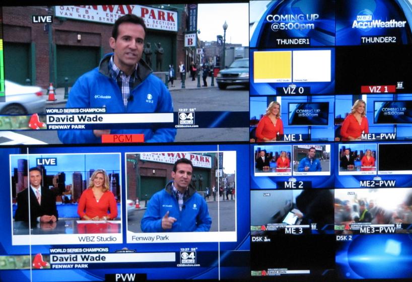 Mike began by telling us a bit about the station and its history. WBZ-TV is Channel 4 in the Boston area, and is owned by CBS Corporation, which also runs WSBK-TV (channel 38). Mike then brought us to the newsroom, where we learned a bit about the path taken by a story before it ends up on the air. Our visit was timed to allow us to be present for the noon newscast, being anchored by Paula Ebben, with meteorologist Todd Gutner presenting the weather. Note 1 The photo below shows the set, with anchor Paula Ebben at the news desk, just one minute into the broadcast: ![]() Note that there are no camera operators - the cameras are remotely controlled from the control room. Over to the right, you can see the separate set used for the weather forecast. Weather is a major preoccupation in New England - a considerable percentage of each news broadcast is devoted to the weather. I've noticed that a lot less time is spent on the weather in European news shows. Because I expressed an interest (engineer that I am), Mike took me off to the control room during the broadcast - all the others in our group stayed in the studio. During the newscast, I took the following photo of one of the large multi-window monitors in the control room (click on the image to zoom back and see more of the monitor). It shows David Wade, normally a news "anchor", broadcasting live from Fenway Park. Our visit was the day after the Boston Red Sox won the baseball World Series, so news of the city's celebration dominated the newscast. ![]() The lower-left of the image shows the feed from the studio, with Todd Gutner on the left and Paula Ebben on the right. The image isn't the sharpest, because it's a photograph of a monitor. I'll write more about what I saw in the control room in a subsequent blog entry.
