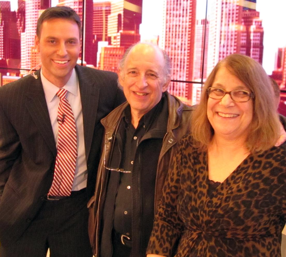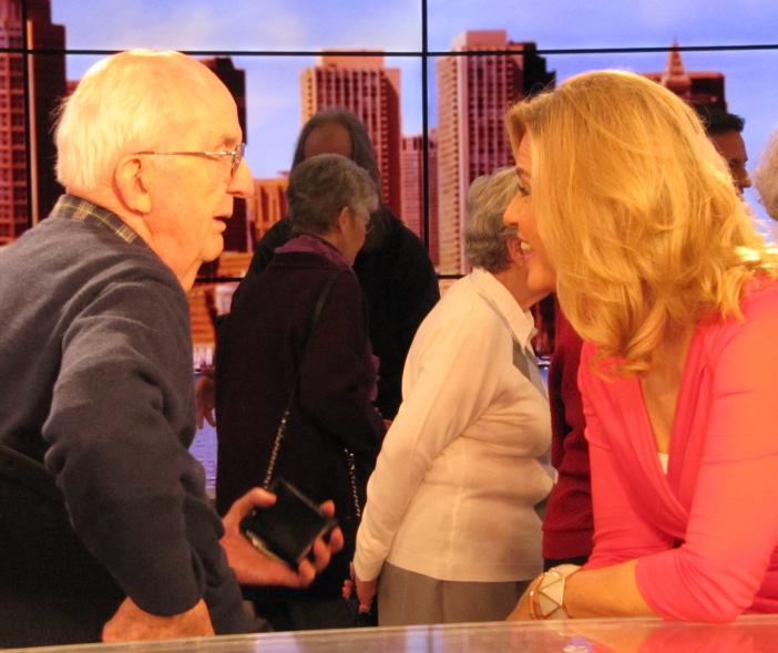 The news desk is much more brightly lit than the rest of the room. The lights are however energy-efficient LED lamps, which are far cooler than the high-intensity incandescent lamps that used to be used. Great care goes into the lighting to avoid dark areas or glare. In addition to multiple lamps, I noted many black boards strategically hung from the ceiling to prevent excessive light from reaching certain areas. Note 2 The picture below shows Meteorologist Todd Gutner with me and Margie: