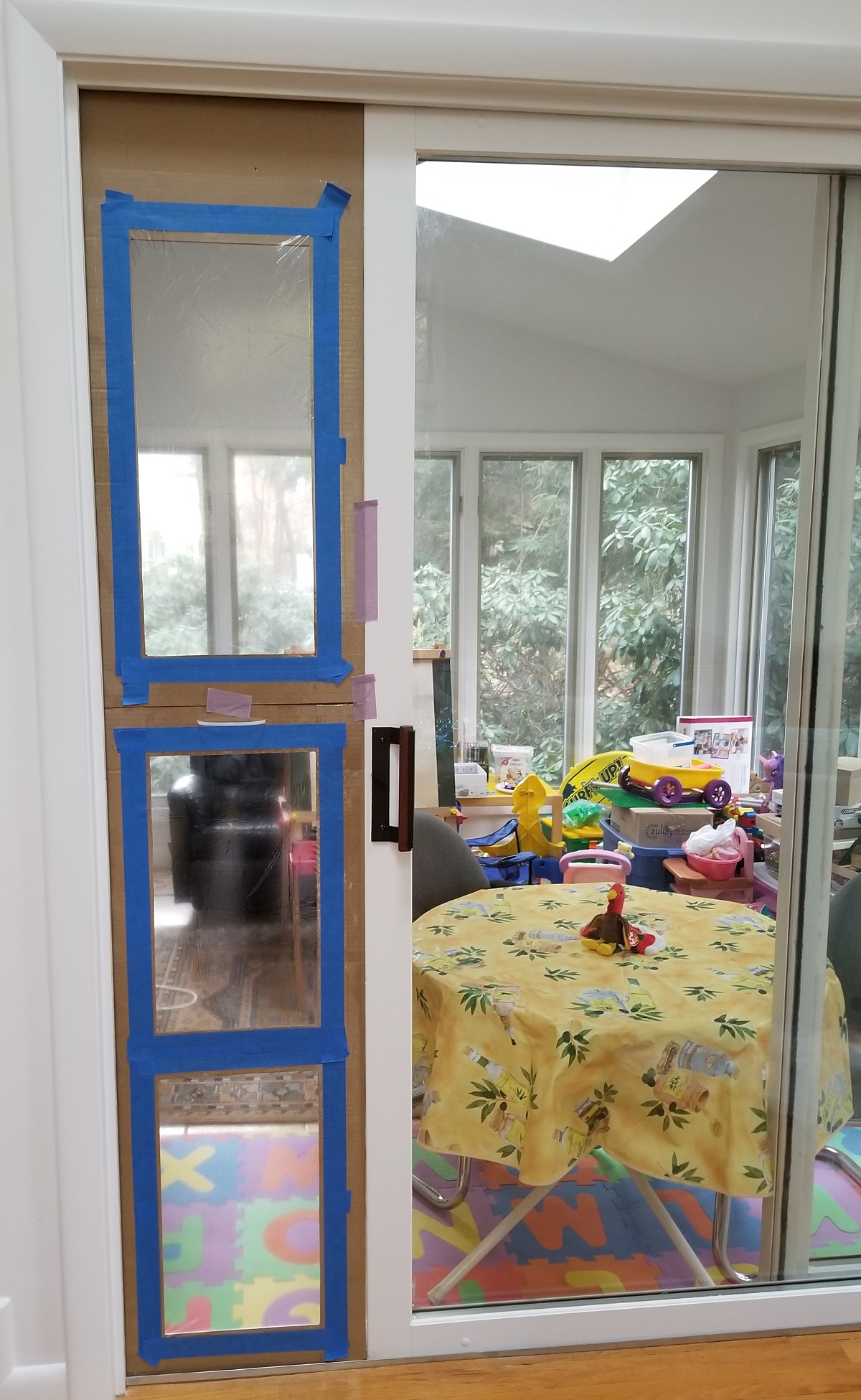 ![]() ![]() Note 1: Quarantining meant no getting together with anyone, including medical appointments, and no going into stores. All our shopping was done using InstaCart. Items coming into the house, including mail, were put aside for a few days. Packaging was removed or sanitized. [return to text] Note 2: This footnote gives details that I thought might be excessive if included above: My original thought was to open the door fully, and fill the entire space with a large piece of plastic film, mounted to a wooden frame. I ultimately decided to open the door only partially, to make the frame carrying the film easier to construct. My initial thought was to make a frame for the plastic film out of wood. But I had a couple of large, heavy pieces of cardboard available, so I used that instead. The cardboard is coated with clear packing tape on one side, to allow masking tape to be used to adhere it to the sliding door and the door frame, yet still be easily removed without damage. My first try at a plastic film was to use a plastic food wrap, Kirkland stretch-tite®, from Costco. It has the great advantage of being extremely clear, and of allowing sound to pass with almost no attenuation. But it has the great disadvantage of being too easily punctured, being only about 0.35 mils in thickness (about 0.0089 mm). I looked at some 3-mil plastic bags I had, and decided that a clear plastic material of about twice that thickness would be suitable. I used various types of tape in this project. Clear packing tape was used to coat the cardboard frames on one side. Two different masking tapes were used, both Scotch® brand tape from 3M. The plastic film is held in place by Scotch-Blue™ Painter's Tape for Multi-Surfaces #2090. It holds quite well, but can be removed and replaced if a plastic film pane gets damaged or dirty. Finally, the entire frame assembly is taped to the door frame and the door with Scotch Delicate Surface Painter's Tape #2080. It provides a good seal with little risk of damaging the finish of the door. One of the problems I might have encountered had I tried to use wood in a project to be accomplished during the pandemic: it would have been very hard for me to buy wood. Remember, I'm not going into stores, and I certainly didn't want to go into, for instance, Home Depot in order to pick out the wood I would need. I could have tried another approach, of course: leave the door fully closed, and build an electronic sound system allowing conversation across the barrier - a microphone on each side connected to a speaker on the opposite side. I thought this would be difficult to do, however, in a manner that would be intelligible, yet prevent runaway feedback. For non-US readers: the "yardstick" in the photo is marked off in the English-system units "inches" (1 inch = 2.54 cm). A "foot" is 12 inches, and a "yard" is 3 feet. So the yardstick is just a bit shorter than a meter; specifically, 1 yard = 0.9144 meters. [return to text] Note 3: An issue I didn't think of until we had it set up is the fact that opening the outside door produces an abrupt change in air pressure in the sunroom. When I first set up the divider, I had not yet taped it in place. When I opened the door from the kitchen to the sunroom (a door which opens into the kitchen), so much air was sucked out of the sunroom that the cardboard frames popped inward. The seal between the sunroom and the living room is good, but it's hardly a hermetic seal, so such pressure changes do produce some exchange of air (and with it, perhaps some droplets carrying virus particles). I just seal it as best I can, and I also put signs on the exterior door instructing that it be opened and closed slowly. [return to text]