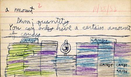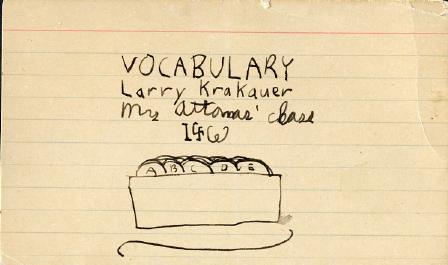 I then added on each card an illustration to go with the sample sentence. I can't recall if this was something that everyone had to do, or if I just decided to do it on my own. I recall that I had taken an after-school course given by a local cartoonist. If you flip through the 21 cards contained in this entry, I think you'll find that the drawings betray my scientific and technical orientation, even at the age of 11. Note 1