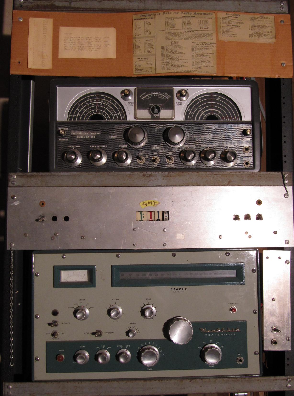 My ham radio rig - click to enlargeSo I brought my ham radio rig in to the lab. It's shown to the right (the Hallicrafters SX-100 short-wave receiver is on top, and the Heathkit Apache transmitter is on the bottom). Greenblatt and two others (Jack Holloway, and a third person who may have been Tom Knight) invested in a beam antenna for the 20-meter band, which they mounted atop a (nearly) 30 foot tower strapped to the side of the elevator-control-house on the roof of our ten-story building, 545 Technology Square (our lab was on the ninth floor, and the 10th floor was a machinery floor). The 20-meter band at that time was open to Europe (this varies with the 11-year sunspot cycle). Our CW (Continuous Wave, i.e. Morse code) power of 180 Watts, along with a highly directional antenna at that height, gave us quite a decent signal.
