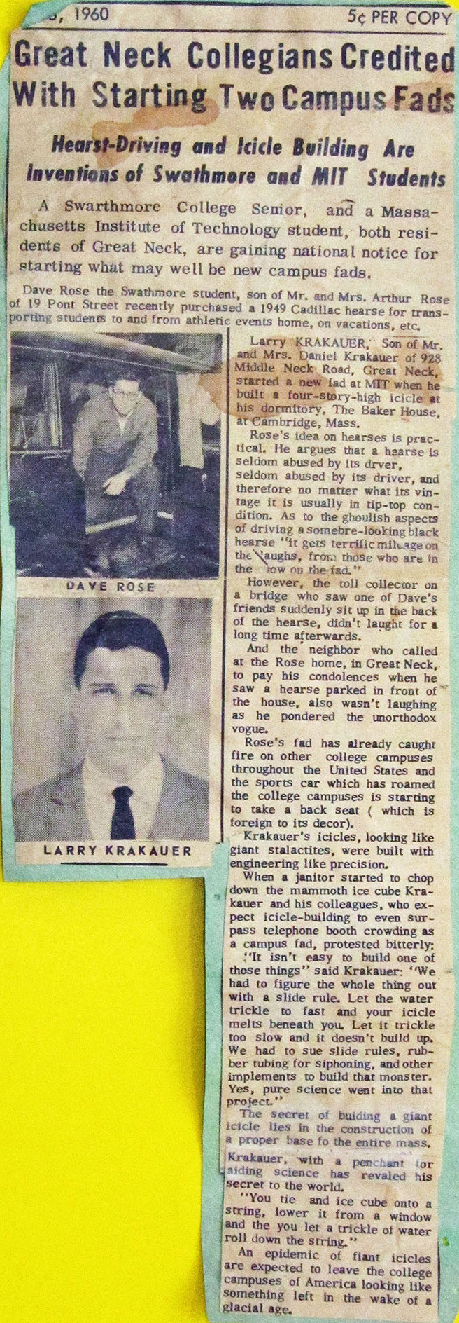 Larry KRAKAUER, son of Mr. and Mrs. Daniel Krakauer of 928 Middle Neck Rd., Great Neck, started a new fad at MIT when he built a four-story-high icicle at his dormitory, The Baker House, at Cambridge, Mass.