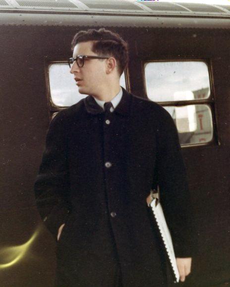 Larry at the start of the run - click to enlargeI started out as a reporter. That is, at the start of the run, I was riding with the party (you can click the photo to enlarge it, and return with your "Back" button). The picture to the left shows me at the start of the run, nicely dressed in a jacket and tie, wearing an overcoat against the April chill, and carrying my clipboard and assorted documentation. The photo was taken by my mother, Rose Krakauer, who dropped me off at the station (not a very long drive from our house in Great Neck, although the house was in Nassau County, not New York City).