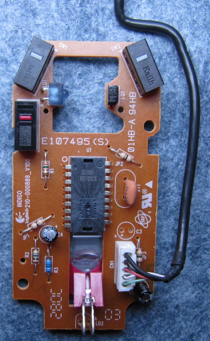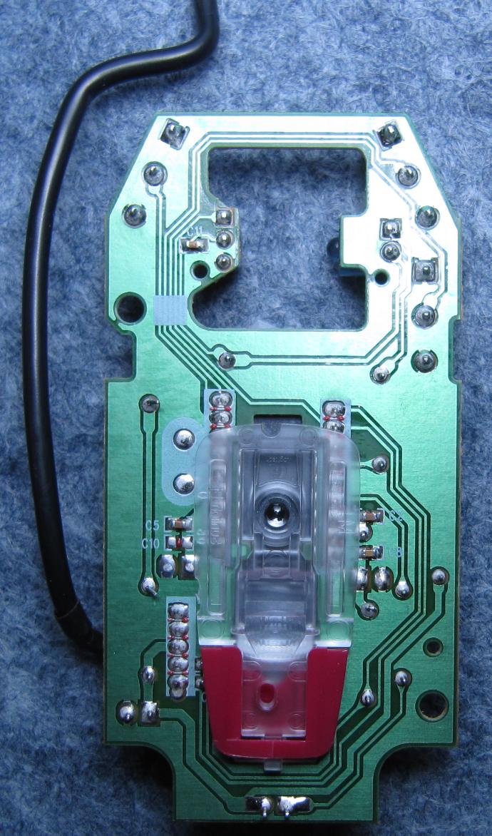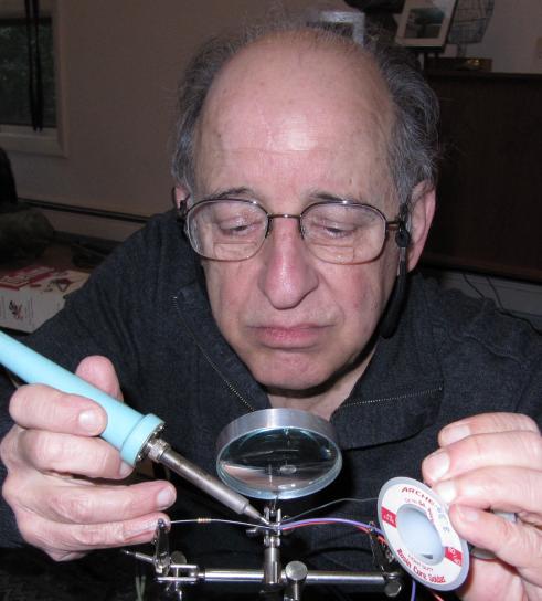 To the right, a quick demo for you. I'm holding the hot soldering iron in my right hand (to your left), and a spool of solder (in the form of a wire) in my left hand. There are many fixtures available to hold wires and electronic components in place while they're being soldered. I'm using a simple one that uses "alligator clips" to hold the wires. It also provides a magnifying glass to help me see what I'm doing close up. The wires being joined can't simply be embedded in a glob of solder. They need to be themselves heated, so that they will be "wet" by the molten solder before it cools. A poorly made solder connection is called a "cold solder joint", generally occurring because the wires being connected were not adequately heated. On the other hand, if you overheat the "lead" of an electronic component (the wire that connects it to the circuit), you can damage the component. You need to heat a connection enough fuse the solder to the wire, but no more. A good soldering iron is thermostatically controlled, so it always maintains the proper temperature. Some electronic components can be seen to the left. Left-to-right, they are two resistors, a transistor, and a capacitor. The "leads" are the wires protruding from the body of the component. In that context, the word "lead" is pronounced LEED, while the name of the metal "lead" is pronounced LED. Ah, such is English. The left-most resistor in the picture has had its leads clipped short, and bent over, probably for insertion into a printed-circuit board, to be discussed below. Here's a close-up of the connection I made, before and during soldering: ![]() But for electronics to have a future, a means had to be found for connecting more and more components, in smaller and smaller volumes, using less and less labor. Numerous ways were developed for doing this, but by far the most important method was the "printed circuit". Look at the small printed circuit board just below. It's actually a board from a defunct optical computer mouse. The top side of the board, called the "component side", is on the left. The bottom side, with the printed circuit, is on the right: ![]() The components seen on the left include resistors, capacitors, and Light-Emitting Diodes (LED's). The three black rectangles at the top are switches, one for the left mouse button, one for the right, and one to sense depression of the scrolling wheel between the two buttons. The larger black rectangle in the middle, with eighteen legs arranges in two rows (a so-called Dual Inline Package, or "DIP), contains the integrated circuit that does most of the work. The component leads go through holes in the board to the bottom, where they are soldered to the printed wiring, as seen on the right. In fact, those solder connections are what hold the components down on the board, in addition to making electrical connections. The thin silvery lines that you can see on the bottom side are the "wires". They are not literally wires, but rather are "traces" of conductive copper. The copper has been plated with a silvery-looking coating to keep it from oxidizing, and then all the traces have been covered with a semitransparent green insulating and protective mask, except in the areas where the component leads have been soldered. Note 2 In my next blog entry, I'll discuss how the solder connections on the bottom of the board are all made almost at once, by a process called "wave soldering". My sister Phyllis once got a summer job in some lab at MIT, so she stayed with me in my apartment in Cambridge that summer. At some point, the lab needed to have some electronic boards hand-assembled, which involved soldering components onto a set of identical printed-circuit boards. In a group meeting, the employees were asked if anyone knew how to solder. Phyllis raised her hand - she had learned to solder in order to make silver jewelry (soldering silver takes a special type of solder made specifically for that purpose). So Phyllis was given a bunch of empty ("unpopulated") printed-circuit boards, boxes of components, and a finished sample board to work from. She then "cloned" the sample board, picking out identical components for each position, bending the leads to the appropriate lengths, inserting them through the holes in the board, and soldering them on the bottom side. Observing some of her completed boards, I noted that she really didn't have to have all the resistors facing the same way, with the colored stripes on the same side as the sample board. Resistors are bi-directional, so they can face either way. But then she asked about the diodes, which looked a bit like the resistors, but with different markings. Uh-oh, the direction of mounting does matter for the diodes. Phyllis decided to just copy everything exactly, so that her boards looked precisely like the sample board in every respect. They were beautifully done. And they worked. Next blog entry: More about printed circuit boards, leading up to the boards I assembled for my first personal computer. It's been previously mentioned in an entry called Personal computers - I built it from a Heathkit. ![]() ![]() Note 1: From the Wikipedia entry on Connections. [return to text] Note 2: These boards are not literally printed, despite the name. Creating them typically involves laminating a thin layer of copper to a board (generally made out of a fiberglass epoxy, for rigidity and long life). The copper is then coated with a layer of a photosensitive "resist", which hardens (polymerizes) when exposed to ultraviolet light. The board is exposed to such light through a photographic negative containing the desired wiring pattern, hardening the resist. The rest of the resist can then be washed off. The board is then etched with acid, to remove any copper not protected by the hardened resist. Finally, the hardened resist is removed with a solvent, leaving the copper in the desired pattern, ready to be plated and masked. Holes can then be drilled for the com