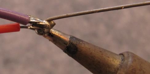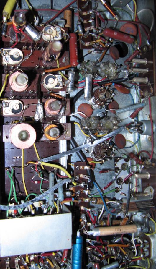 Tipping it up and removing a small cover on the bottom reveals how the components are wired together. They're connected by actual wires, which are joined where necessary by stripping off their insulation, and connecting them by a process called "soldering". This is done by fusing a low melting point alloy of lead and tin called "solder" at the point where the conductors meet. By the way, in the word "solder", the L is sounded in British English, but is silent in American English (we Americans pronounce it as if it were written "sodder"). The soldering of circuits built like this radio was done by hand. After all, electricity was always carried by wires. What more obvious way to link electronic components than to connect them together with wires? Soldering wires together produces a reliable electrically conductive joint.