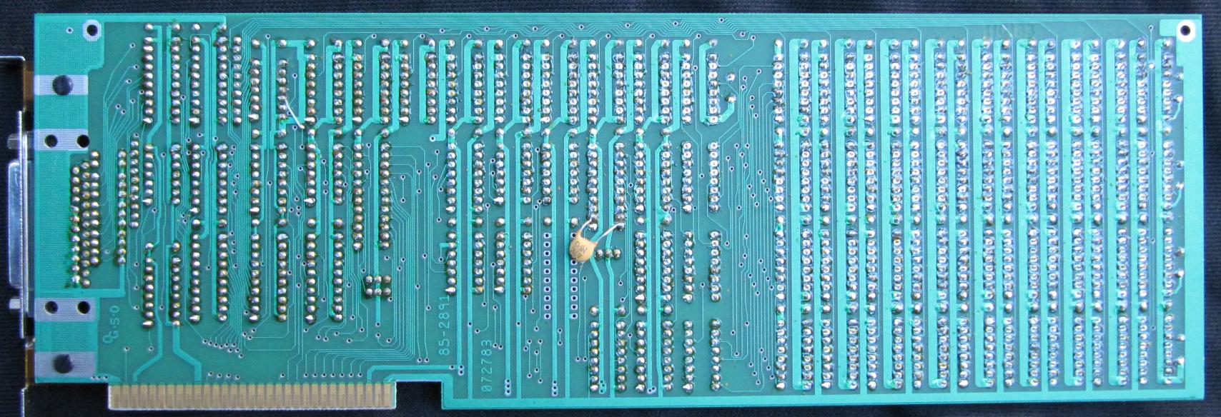 The printed-circuit board shown, with its component leads inserted into the holes in the board, is being carried along by the metal fingers you see in the photo. It first travels over a pre-heater, and then is carried over the wave. The solder wets the component leads and exposed copper traces, and is wicked up into any holes in the board. All connections on the board are completed in seconds. Although I glossed over this in my previous entry, the green "mask" on the bottom of the mouse board is actually a "solder mask", designed to keep solder from adhering to the board anywhere but at the connection points, where the component leads protrude through the board. All the processes of making a completed printed-circuit board are heavily automated. After creating the board, holes of various sizes are drilled by a computer-controlled drill, and the components are inserted by an automatic insertion machine. Finally, the boards are fed through the wave-soldering machine, and then generally washed in deionized water. There's an effort these days to make electronic products compact. Certainly, that's a necessity with things like cellular telephones (I'll talk a bit more about them later in this entry). But let's step back in time a bit, to 1964. Early on, there wasn't much pressure to pack components densely. Look just below at a portion of a printed circuit board from that year: ![]() The board shown is from a PDP-6 mainframe computer. You can click on the picture to see the entire board, which is quite large, about 27 X 24 cm (10.6 X 9.4 inches). The section of the board shown above is about 12 X 8 cm (4.7 X 3.2 inches). On my monitor, the picture above is about 15 percent larger than actual size. My objective in giving these dimensions is simply to point out that the printed wiring on this board is not at all dense. It's clear that in this expensive mainframe computer, which contained hundreds of these boards, no effort was made to make the product compact. I should also point out that the silvery circles seen in the picture are the tops of individual "discrete" transistors. That is, each of these small metal cans contains a single transistor. Of course, if all the "wiring" is on one side of a flat board, it's not possible for one wire to cross over another. But unlike the mouse board, this board has conductive traces on both sides - in the picture, you can see the faint outline of traces on the opposite side of the board. Electronic circuits with any complexity must be built with at least two layers of circuitry. The best layout of the conductors is obtained when most of the conductors on one side of the board go lengthwise on the board, while the conductors on the opposite side go crosswise. To make connections between the opposite sides of a two-sided board, a method was developed to metal-plate the inside of the holes drilled through the board, allowing these holes to conduct electricity from one side to the other. Then, as the technology developed further, additional layers were added in the middle - printed circuit boards these days typically have up to seven conductive layers, each potentially contacting selected plated-through holes. But as you can see from the mouse board at the top of this entry (it's only a few years old), single-sided boards are still used where possible - they're much less expensive. As the state-of-the-art of electronic packaging and interconnection continued to develop, the number of components that could be packed into a given volume of space continued to increase. Printed circuit boards got more dense, with many more thin traces packed into the available real estate. Indeed, nowadays, the "through-hole" technology I've described above is less frequently used for really compact products. Rather a technique called "surface mount" is used, in which components in very small packages are connected to small solder-bumps on the component side of the board only. But through-hole boards were still the dominant technology when I built my Heathkit/Zenith Z-150 computer, a PC clone, in 1984. The board below shows a typical density at that time - the picture shows the Memory board from that computer. ![]() The board shown above is 36.2 cm wide by 11.25 cm high (14.25 X 4.44 inches). The black rectangular devices are digital "integrated circuits", sealed into a type of package called a "DIP" ("Dual In-line Package" - click the link for a Wikipedia article). They are plugged into sockets which are soldered onto the board. You can see a row of empty sockets at the bottom left - they represent a part of the memory array that was not "populated" with DIPs, but the sockets were soldered in place to allow for future expansion. The next picture shows the back side of the same board: ![]() Although wave soldering was certainly available at the time I build this board, it's not something one can do at home - it takes a very large and expensive machine, and a trained operator. Since I built the computer from a kit, I was the one who inserted all the components, and the soldering has to be done after the component insertion. Thus I had to hand-solder every single one of those silvery dots, each of which connects a single pin of an integrated circuit socket, or some other component, to the board's wiring. Note 2