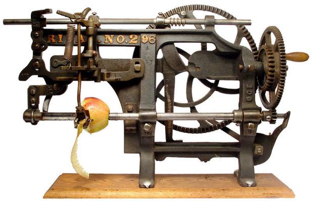 Over the next few decades, they got simpler and simpler, as shown by the example to the right. The same shaft that rotates the Apple is also used as a screw to advance it past the cutter and corer-slicer blades. But every now and then, I come across a design that is so egregiously bad that I almost can't believe it. I can't believe that a designer would have deliberately designed it that way, and I can't believe that a customer would ever have purchased the product. I'll mention a couple I came across recently, which I photographed with my cell phone. They are both sinks with hot and cold water taps, found in public restrooms.