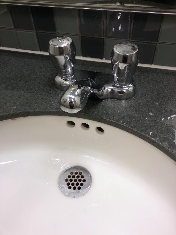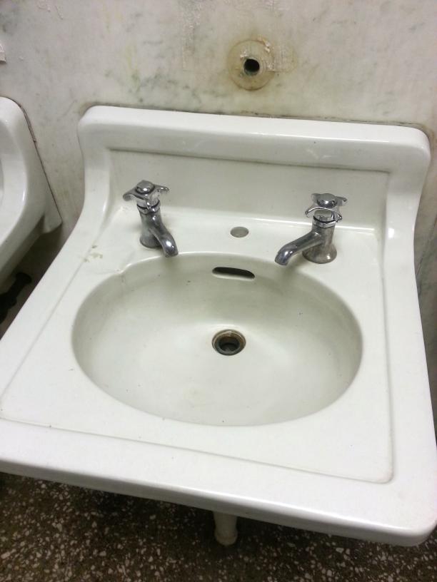 Bad design number two: the water runs only as long as the faucet knob is rotated and held. If the knob is released, it springs back to the off position. This means that you need to hold the knob with your right hand while you wash your left-hand, and hold the knob with your left hand while you wash your right hand. You can't hold both your soapy hands under a spout and rub them together to rinse them, which is what people usually want to do. In other words, this faucet design does an extremely bad job at the sole task for which it was designed: helping you wash your hands. I have no idea if these are the original sinks installed when the building was constructed in 1916, but I can't help thinking that this would have been bad design even back then. The purpose of the faucet valve being only "momentary" (the water runs only as long as the knob is turned and held) is obvious: the designer doesn't want the user to be able to turn on the water and then go away and leave it running. A better solution to that problem was used in the next sink, discussed below.