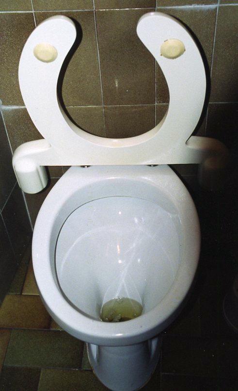 Margie explained that she had been intrigued by some of the toilet designs she had seen in women's rooms in Italy, and she'd taken pictures of them. Since all these photos were taken inside women's restrooms, I had been entirely unaware of this activity. You can see an interesting one to the left. It uses counterweights to lift the seat if nobody is sitting on it. The right side of the photo is shadowed, but the seat unit is symmetrical - it has the same counterweight on the right side as the one you can see clearly on the left, sticking out and down from the raised seat. When the seat is down, the counterweights, on the opposite side of the hinge, are raised up. There's no doubt a heavy weight inside them, probably a hunk of lead. This makes them heavier than the seat itself. Thus, if nobody is pressing down on the seat, the counterweights in the back drop, lifting the seat in front. Note 2 By using counterweights instead of springs, there are no working metal parts that would need to survive the somewhat corrosive restroom environment. Since the weights can be molded into the same plastic used to mold the seat itself, the entire unit is smooth and can be easily washed down. I don't know why I've never seen such a thing in the United States. It probably could have saved a few marriages. Seen any other bad designs? Let me know, and maybe I'll write a blog entry on them.