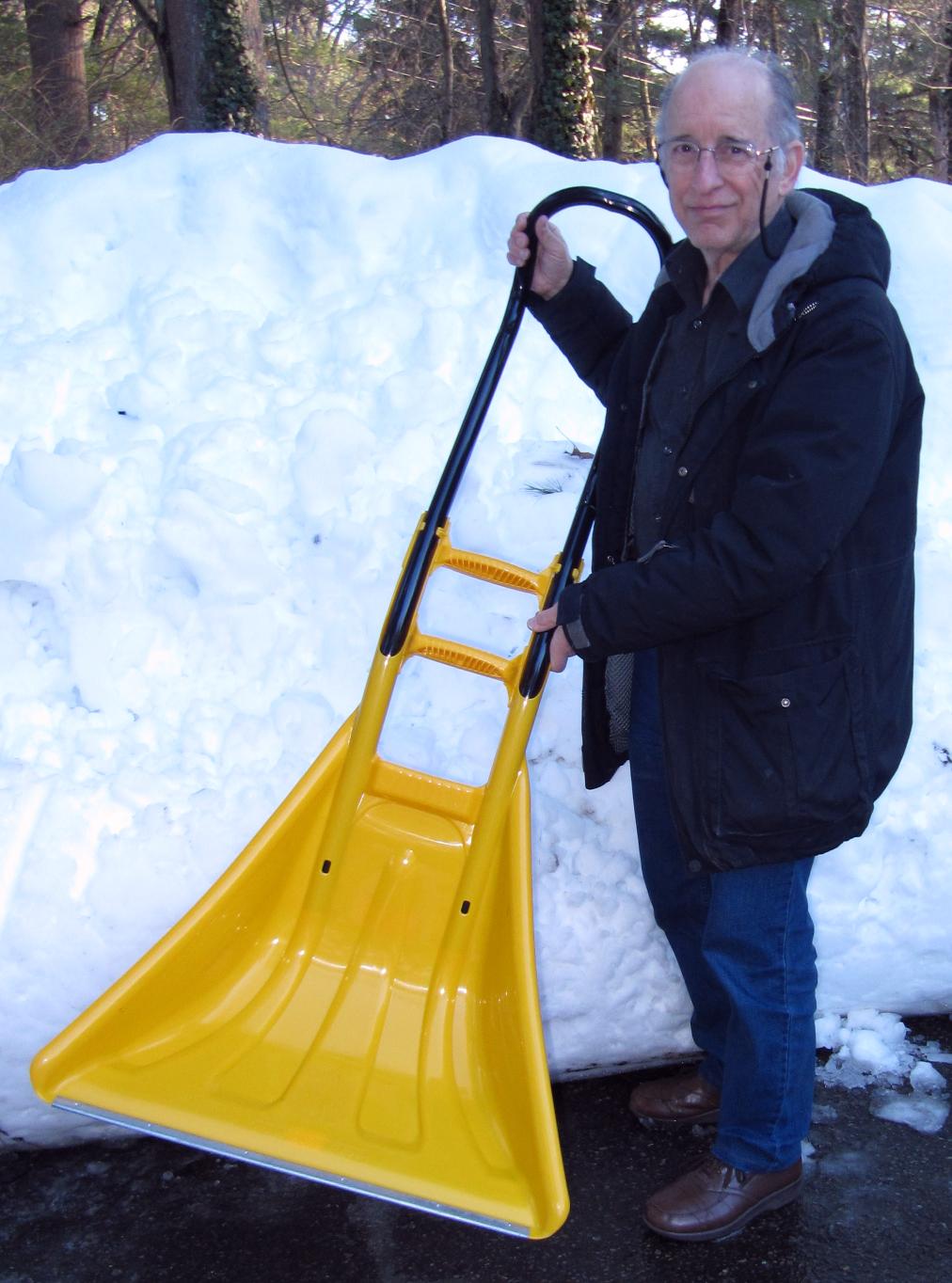 It has a metal blade along its front edge to easily slide its high-capacity scoop under the snow. You can push it with your foot against the back of the scoop. It can then be picked up by either of the two handles, depending on the weight of the load. Or, once it's loaded with snow, you can tip it back, and slide it along the ground like a sled. If you then push it to a dumping area, it can slide up a mound of snow, without having to be lifted. If you then stop it abruptly, its load will keep going, sliding off the slippery surface. Do a Google search on "snow shovel" or "snow scoop", and you'll come up with all sorts of additional clever possibilities. Of course, I could just move to Florida. But living here is much more interesting.