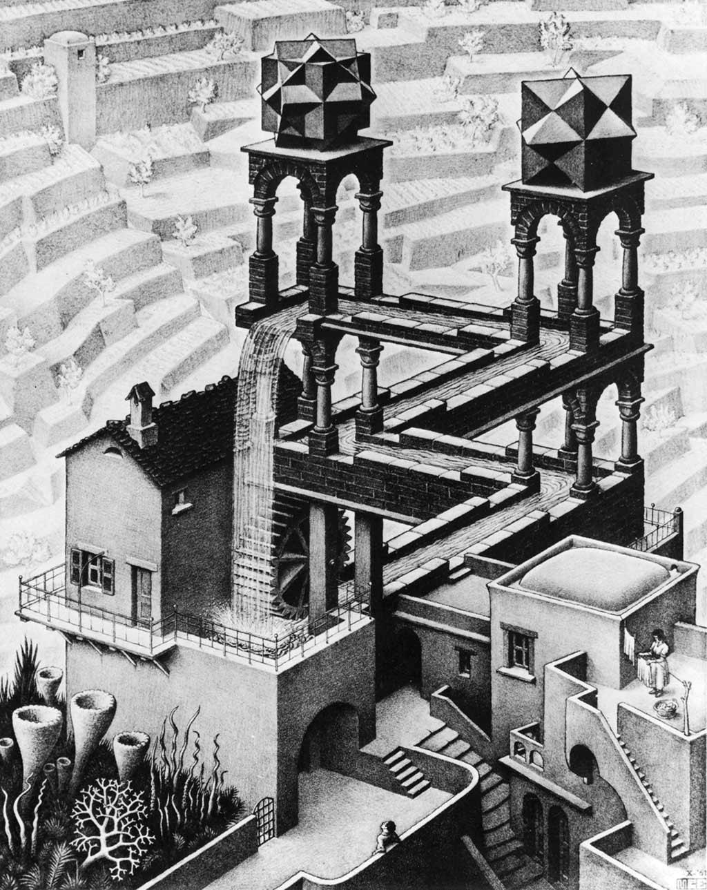 M. C. Escher's impossible millWhen you think of impossible images, M. C. Escher usually comes to mind. To the left, one of his iconic drawings.