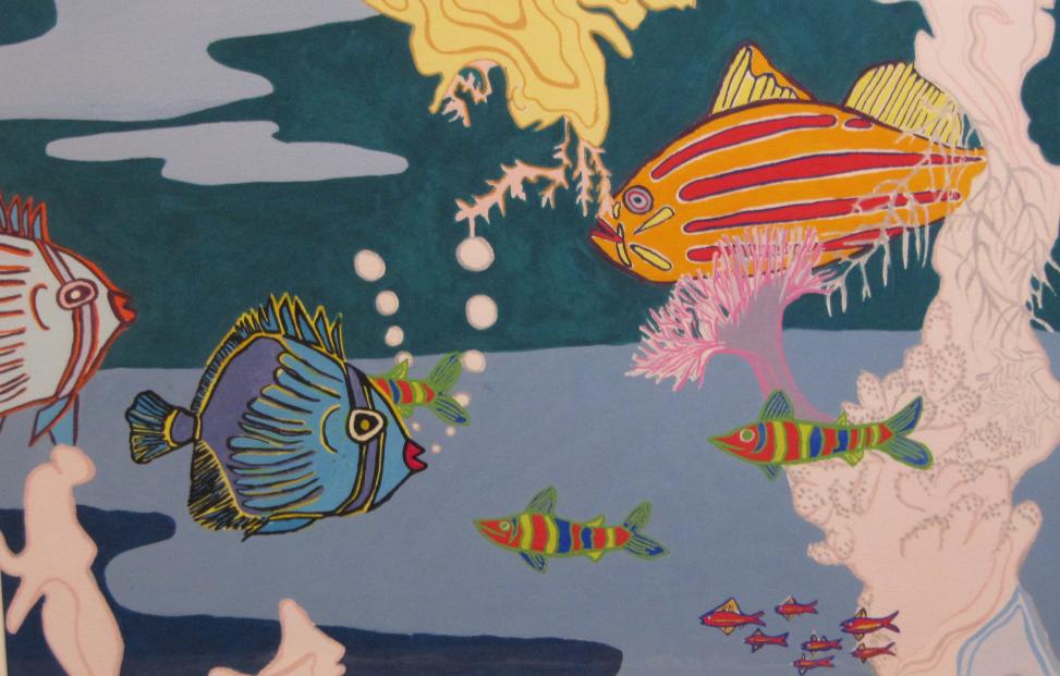 In writing this blog entry, I also noticed, for the first time, that the streams of bubbles are going behind a smaller fish which is itself behind the fish emitting the bubbles. How could that be? If the larger fish is in front of the smaller one, then the stream of bubbles also needs to be in front of the smaller fish.